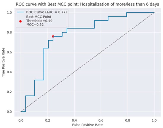 The performance of the classification model was evaluated on the test set using a Receiver Operating Characteristic (ROC) curve, as shown in Figure 5. The area under the ROC curve (AUC) was 0.77, indicating a satisfactory discriminatory performance. Using the matthews_corrcoef function from the sklearn library [], the point on the curve (in red) corresponding to the highest Matthews Correlation Coefficient (MCC) was highlighted to identify the optimal threshold for classification. At a threshold of 0.49, the model achieved a maximum MCC of 0.52, indicating a moderated correlation between predicted and actual outcomes. The MCC is valuable in this context due to its robustness in scenarios involving class imbalance.