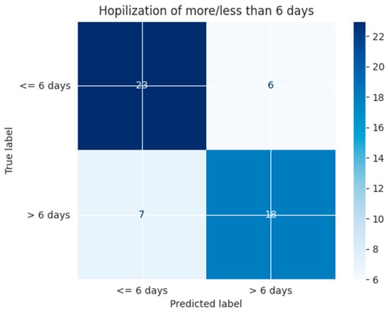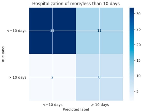 Figure 8 represents the obtained confusion matrix, where we can observe that the model correctly classified 32 out of the 43 patients who require less than 10 days of hospitalization, and 8 out of the 10 patients who require more than 10 days of hospitalization.