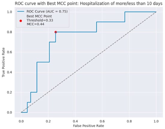 The performance of the classification model was evaluated on the test set using a ROC curve, as shown in Figure 7. The area under the ROC curve (AUC) was 0.75, indicating a satisfactory discriminatory performance. Using the matthews_corrcoef function from the sklearn library [], the point on the curve (in red) corresponding to the highest MCC was highlighted to identify the optimal threshold for classification. At a threshold of 0.33, the model achieved a maximum MCC of 0.44, indicating a moderate correlation between predicted and actual outcomes.