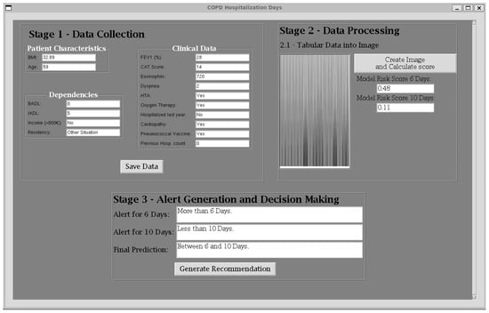 Screenshot of the main interface of the tool. The interface presents three main panels: Panel (1) is related to the collection of patient data; Panel (2) has two sub-panels—Panel (2.1), related to the transformation of the tabulated data into an image, and Panel (2.2), related to the calculation of the risk score of days of hospitalization. Panel 3 shows the interpretation of the results obtained in the previous panel and provides a recommendation regarding the condition of the patient.