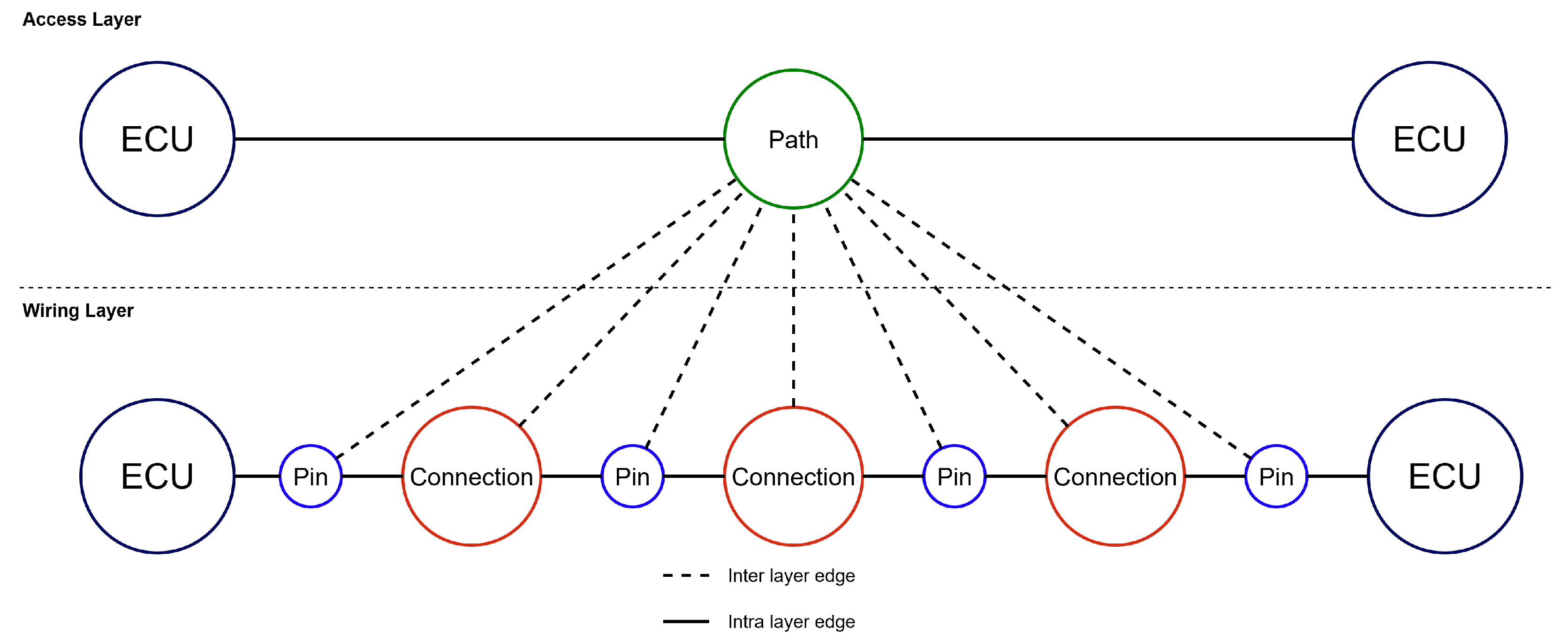 - Wiring layer: The shadow of an ECU at this tier is the set of its physical terminations: pins, splices, … Conductive elements themselves are also nodes: each Wire node is linked by plain connect edges to the two Pin nodes it terminates on (or to a Pin and a Splice node, and so forth). This yields an accurate representation of the harness while preserving a one-type-of-edge policy.