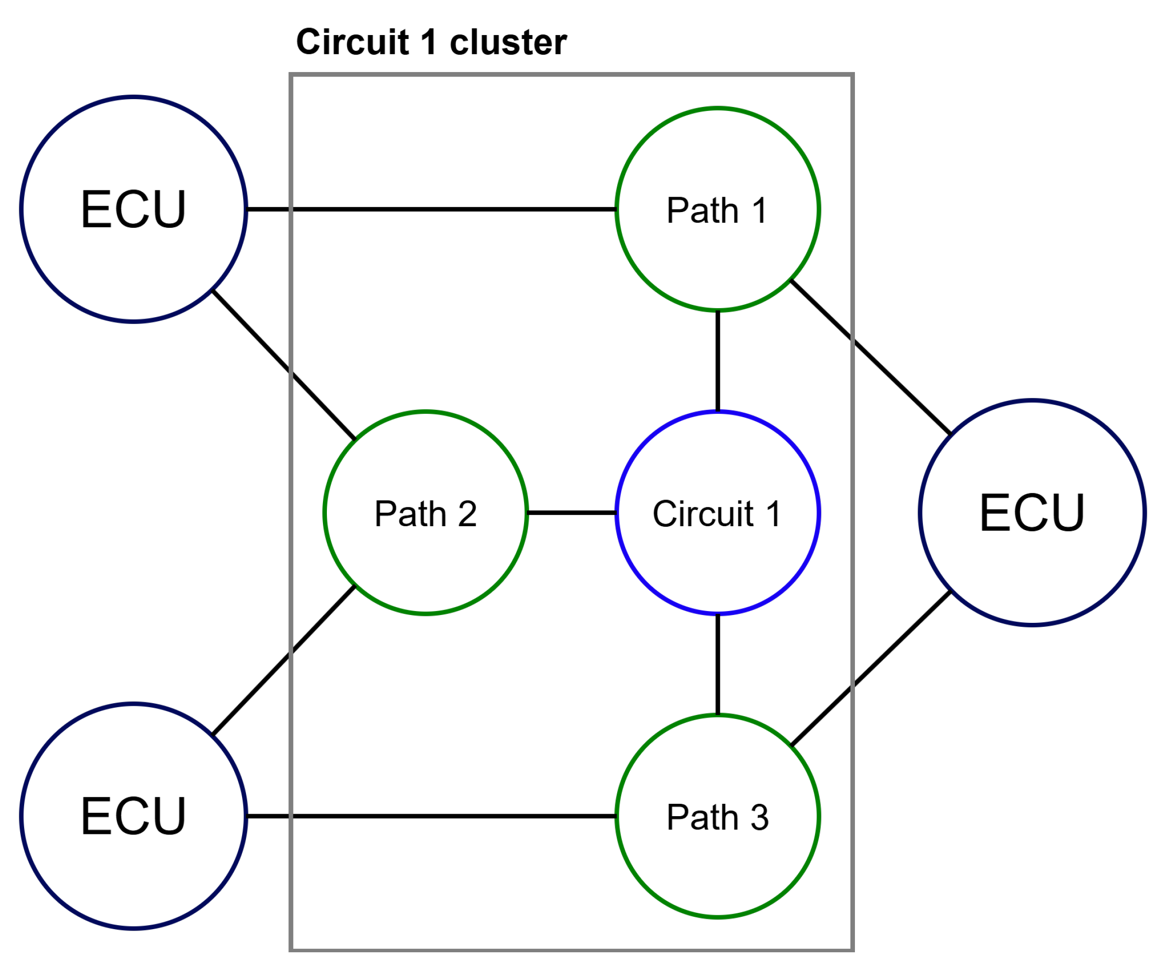 - Access layer: The same ECU casts a coarser shadow: a single Component node. Functional bundles are represented explicitly as Path and Circuit nodes; they connect to Component nodes via simple connect edges as well. Thus, a Path node can fan out to several Component nodes without overloading the edge semantics.