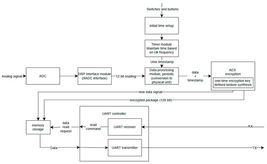 The FPGA device acquires output voltage from an external analog sensor for which a subsequent conversion is implemented. Input data are converted to digital with the built-in ADC. This digital value is then calculated to a corresponding unit of measurement, based on specific manufacturers’ look-up tables of the sensor, which reflects the nonlinearity of the output value. Then, the acquired data from the measurement and the timestamp together are encrypted with a specific key and method. Finally, all data are sent via UART as a stream to be stored on the on-chip RAM and extracted on request to the main computer for further processing and analysis.