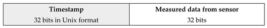 Data collection is performed periodically, and at each measurement a corresponding package is constructed. The content of the package includes 32 bits for the timestamp followed by 32 bits for the measured value, making a total of 64 bits—Figure 2. Thus, the data lengths are convenient for processing with a computer when they are retrieved.