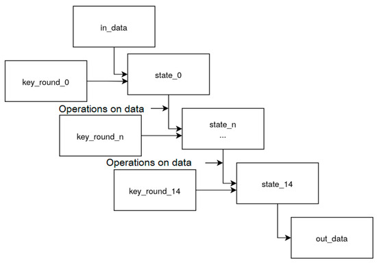 The AES algorithm can be described as two distinct procedures. The first one is the generation of the key schedule. It is an iterative application of operations, starting with the value of the initially set cryptographic key. These operations are repeated a number of times, depending on the length of the key. This procedure is performed only once during initialization and since the cryptographic key cannot be changed while the device is working, it is never performed twice or more. The second procedure is the encryption itself. It is also iterative and each iteration takes the 128-bit state from the previous one and produces the next state based on it and the corresponding part of the key schedule. The number of states that are produced can be 10, 12 or 14 depending on the key length [19]. Because of the conveyer principle in the implementation on every clock cycle, all of the states need to be read and written and all of the key rounds need to be read simultaneously, as shown in Figure 3. This causes a large amount of resources to be used, potential timing issues and an inability to use RAM for both the states and the key schedule. Because of that, optimizations are implemented for the design to meet timing requirements.