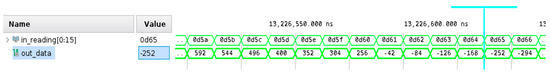 Here, we present some results from the simulation of the prototyped system’s modules that present its main functionalities. Figure 5 shows simulation data of the conversion function. The simulation passes through all possible 12-bit values from the ADC to the input and displays what the output would be. The algorithm for conversion is linear interpolation and, as displayed in the simulation results, it accurately converts the received data to thousandths of the degree. The ADC is implemented directly into the design as an IP to represent the physical structure of the ADC as part of the FPGA architecture.