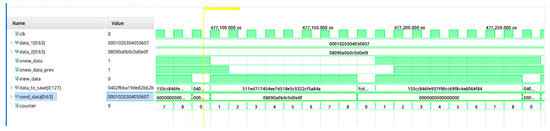 Figure 6 presents simulation results from the encryption. First, 64-bit measurements are passed to the data encryption module. The encryption, however, is performed only when every second package is received. That way, the 128-bit encryption package is populated with two 64-bit packages with collected data. In the simulation, it can be seen that there are two different values on the data_to_save signal for the two different sets of data that are passed (all zeroes and “00” to “0F” in hexadecimal). Every time a new data package is encrypted, the signal onew_data is inverted to signal that there is new data to the memory module.