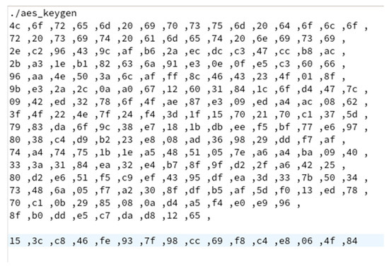 In Figure 7, the generation of the round key is demonstrated. When compared with the key schedule, produced by the OpenSSL library, and given the same encryption key, the result is exactly the same. The encryption result in Figure 6 matches the one produced by OpenSSL, too. The results of the OpenSSL library used for comparison are shown in Figure 8.