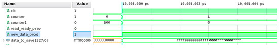 In Figure 9, the data that is found in the data_to_save signal is written to memory. This simulation shows only the way of signaling that there is new package to write.