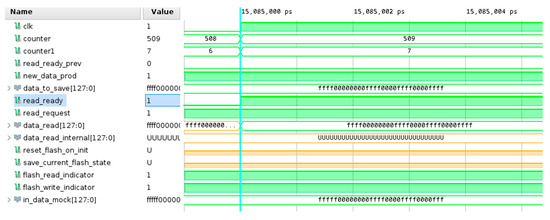 In the simulation in Figure 10, a read operation is performed in which the same data package written in Figure 9 is read. The result can be seen in the data_read signal, and the read_ready signal is inverted when the read operation is ready. Before the point displayed in the simulation, the signal read_request needs to have been inverted to initiate the read operation. As can be seen from the simulation time on top, the time of the read is after the time of the write.