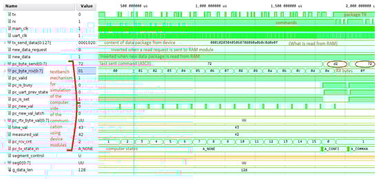 This simulation can be viewed as a timing diagram for the UART communication and serves as a depiction of the working principle of the communication. The codes of the commands can be seen in the pc_byte_send signal (circled in Figure 11: commands d2 for data confirmation and 72 for a request). The same data from the tx_send_data signal can be observed to be received in the pc_byte_rcv signal. The communication can also be seen in the Tx and Rx signals in UART format.