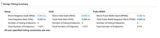 The timing requirements are met by the design, as shown in Figure 12. After implementation, the device utilization report—Figure 13—confirms that all types of resources needed to implement the actual design are far below the chip limitations (from 12% for the FF to 51% for the block RAM).