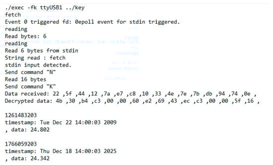 There are three CLI commands defined in the application. The command “fetch” sends a request for just one entry in the FPGA device. If an entry is received, the data are decrypted, displayed in a human-readable form and stored in a CSV file. One package received from the device should contain two consecutive measurements. Another command that is defined is the command “fetch all”. This command sends a request to the device just like the first one. Unlike it, however, once a package is received, another request is sent immediately and that continues until no response is received from the device. To determine that all the data saved on the device is retrieved, a timer event is used that creates a read event on a file descriptor once a certain time has passed. That way, with the sending of each request, a timer event after one second is scheduled. If a package is received before the timer expires, the timer is stopped. If no data are received before the timer event, a message is displayed, indicating that all packages on the device are retrieved and in the case of a “fetch all” command, the sending of requests to the device is stopped. The last command is “terminate”. It is used to terminate the application’s execution, freeing all used resources.