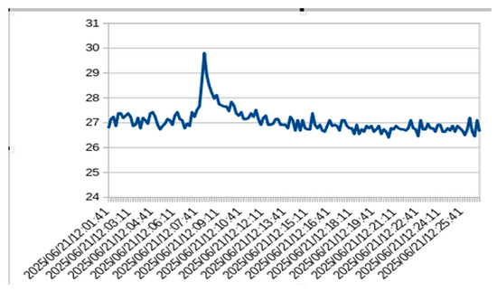 The diagram in Figure 15 shows the data collected in a 25 min period at an interval of 10 s. It can be observed that there is a spike in the reading. This spike was caused on purpose by touching the sensor and affecting it with body temperature. The diagram was created by directly importing the file generated by the application into the applied software.
