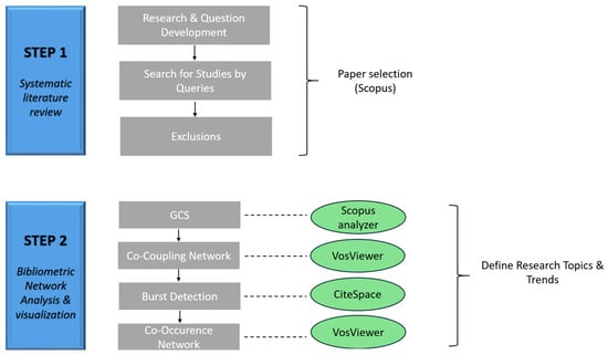 During the research, several software tools were used in the Bibliometric Network Analysis and Visualisation steps. For the GCS, we used the Scopus analyzer. For the Co-Coupling Network and the Co-Occurrence Network, we used VOSviewer (version 1.6.18). For the Burst detection step, we used the CiteSpace (6.3.R1) app [].