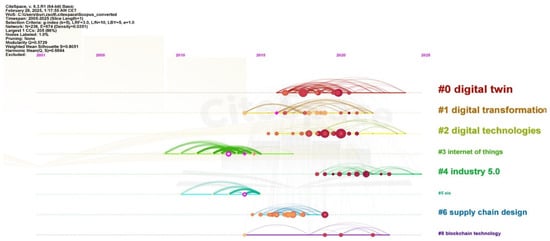 The CiteSpace app is a bibliometric and scientific network analysis software designed to track scientific trends, research areas, and collaborations among researchers. One of the features of the software is Burst Detection Analysis (BDA), a method for identifying topics of high interest at specific times. The method consists of creating a database of the most relevant data and loading it into the program’s settings. The algorithm can work in several ways; for example, it can indicate a sudden increase in the number of citations []. Our research is based on keywords that can be used to determine the direction in which research into the relationship between Industry 4.0, Industry 5.0, and digitalisation is heading. For data collection, we used the same Scopus database as in the previous steps. The period chosen for the study is 2005–2025. A citation threshold (G-index) was defined within the program, below which no publications were examined. By clustering, the software identified the most important topics within the relevant discipline. Burst Detection Analysis analysed the frequency of occurrence of keywords and ranked them according to frequency. Modularity and density measures determine the internal coherence of article groups within keyword articles and the strength of these coherences []. Figure 3 shows the most important keywords related to Industry 4.0, Industry 5.0, and digitalisation.