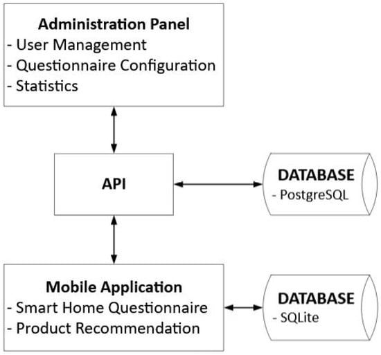 This section presents an integrated decision-making system designed for generating personalized SHMS selection recommendations. The solution includes three essential components: a browser-based administration dashboard, a mobile application for end users, and a relational database that ensures information storage and accessibility. The interaction of SHMS Selection System Components is presented in Figure 1.