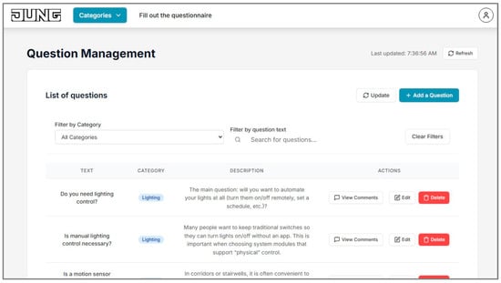 In addition to the literature trends, the empirical testing of the proposed selection methodology provided practical insights into the decision-making process for building management systems. The methodology was evaluated both by specialists (system integrators, designers, architects) working with real projects and by students (inexperienced users) preparing independent assignments and final theses in the course “Building Management Systems.” Evaluators confirmed that the questionnaire structure enables informed system selection. Unlike manufacturer-specific tools, this application is designed as a universal selection system. The JUNG solutions were used solely for system testing and design development purposes.