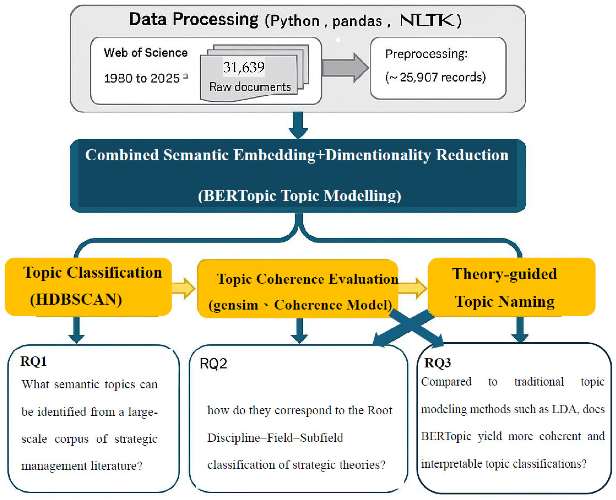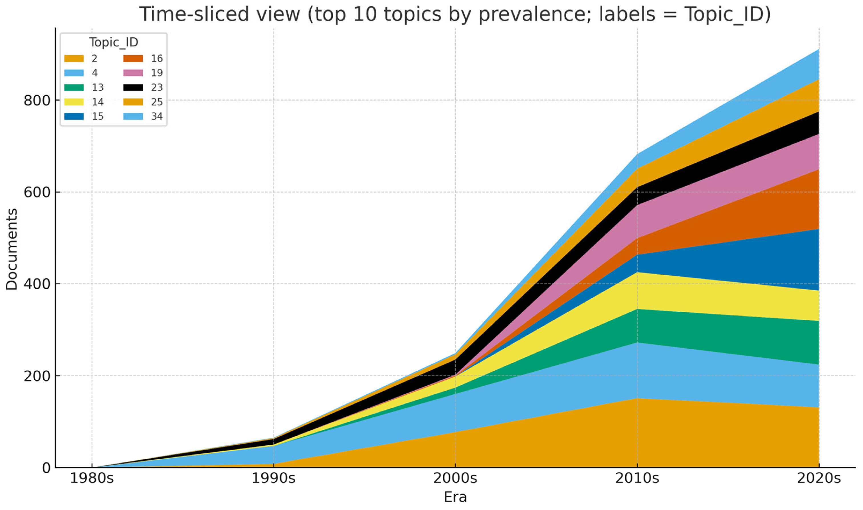 - O3 (Temporal structure): Provide a time-sliced view of topic configurations to describe shifts in emphasis across strategic traditions (1980–2025).