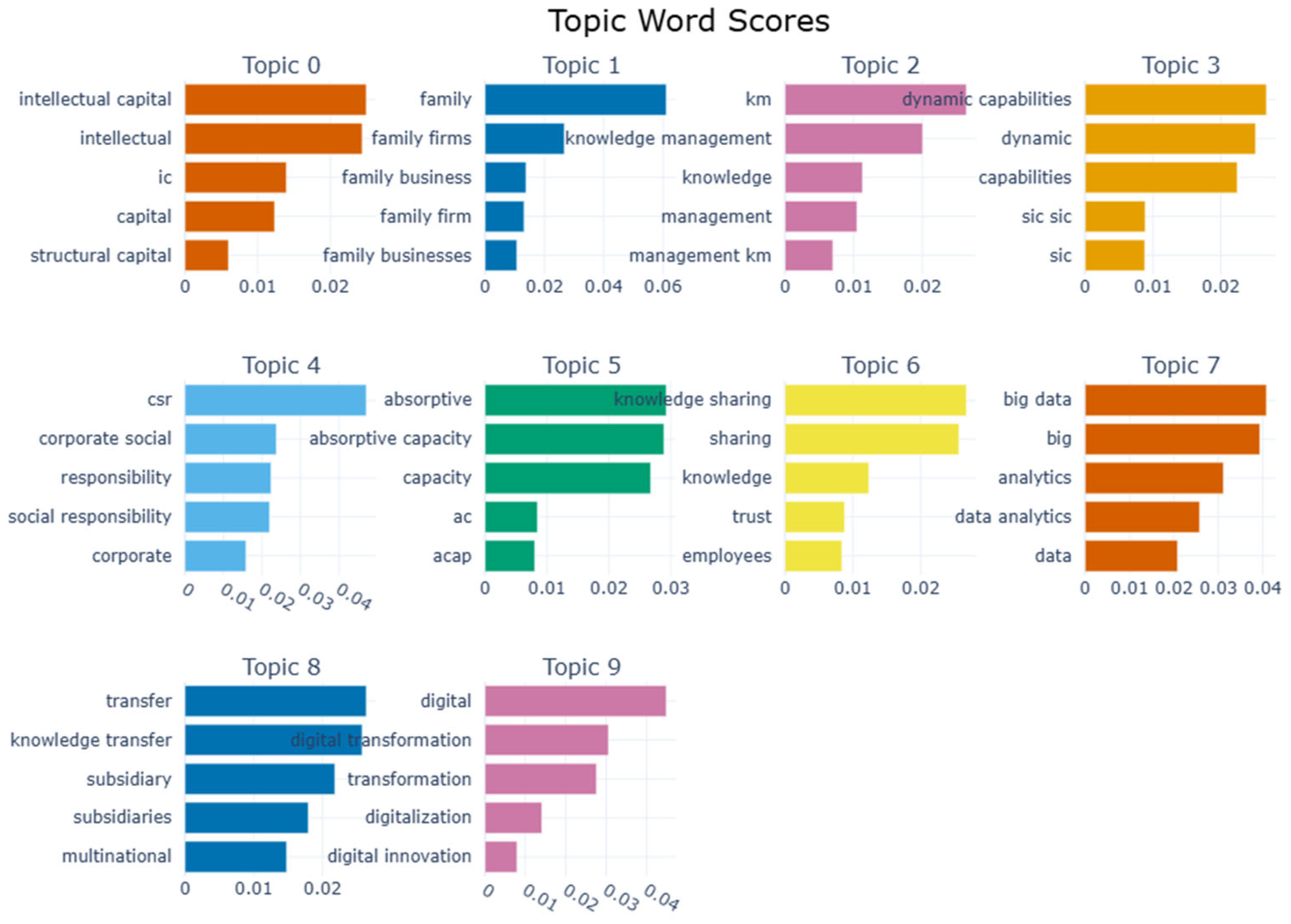 - Topic 2 addresses knowledge management and resource configuration, incorporating phrases like “knowledge management” and “management KM,” reflecting discussions around dynamic knowledge capabilities and organizational learning.