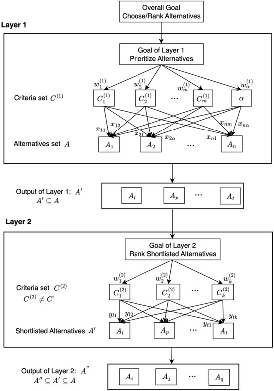 The model introduces a sequential structure in which different sets of alternatives are assigned to distinct stages of the evaluation process. In the first layer, strategic importance is emphasized by considering objective criteria and decision-makers’ preferences. The second layer then focuses on feasibility by incorporating practical constraints.