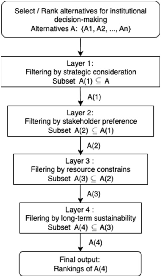 Figure 2 illustrates how the framework can be extended into a multi-layer model. In this example, Layer 1 applies strategic criteria to reduce the alternative set. Layer 2 then evaluates these alternatives under stakeholder’s preference, narrowing them to a smaller alternative set. Layer 3 concerns resource constraints, and Layer 4 incorporates long-term sustainability to select the optimal alternative.
