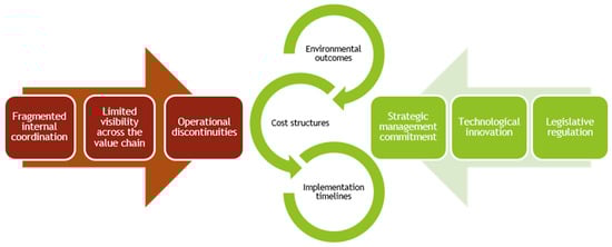 The success of implementing a circular economy also depends on internal integration. This describes the extent to which different functional units and departments (e.g., research and development, design, production, procurement, reverse logistics, and after-sales) coordinate and collaborate within an organization [26]. Strong internal integration is vital for effectively and coherently implementing circular economy practices in the automotive industry. For instance, effective ecodesign necessitates close collaboration between the design, production, and recycling teams. Integration reduces organizational ‘silos’ that can hinder information flow [6], lead to suboptimal decisions, and create misalignment between operational activities [25] and strategic sustainability objectives.