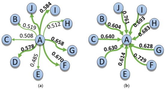 Influence relationships of factor A: (a) Network of influence from factor A to the other factors; (b) Network of influence on factor A from the other factors, where A Top management commitment, B Stakeholder engagement, C Regulatory alignment and policies, D Technological capability, E Internal integration, F Sustainable material and recycling management, G Ecodesign and product sustainability conception, H Organizational culture and awareness, I Circular business models and value strategy, and J Innovation and research and development capacity.