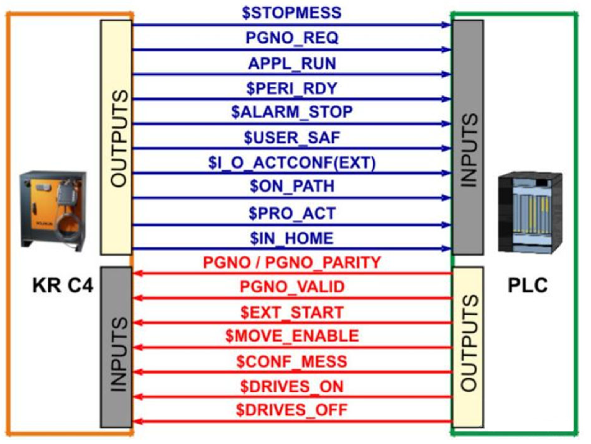 - The PLC sends an EXT_STAR (pulse signal) to the robot to start it;