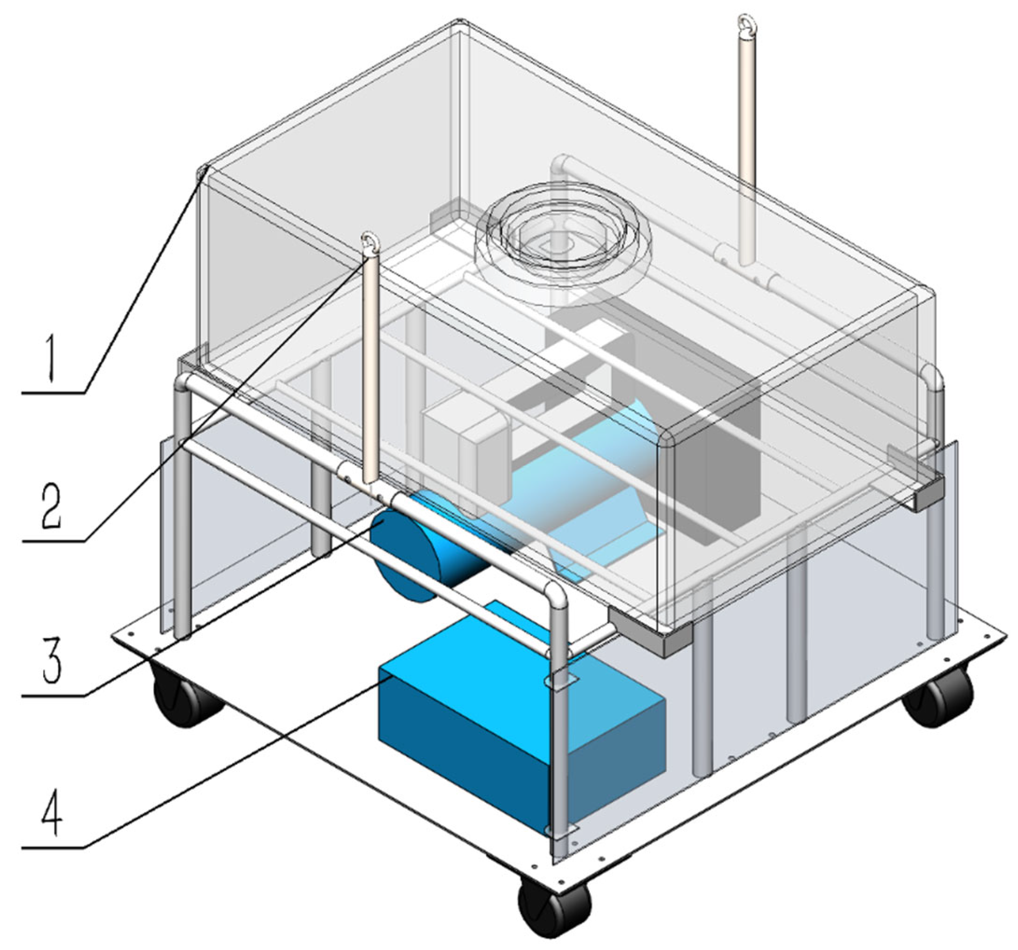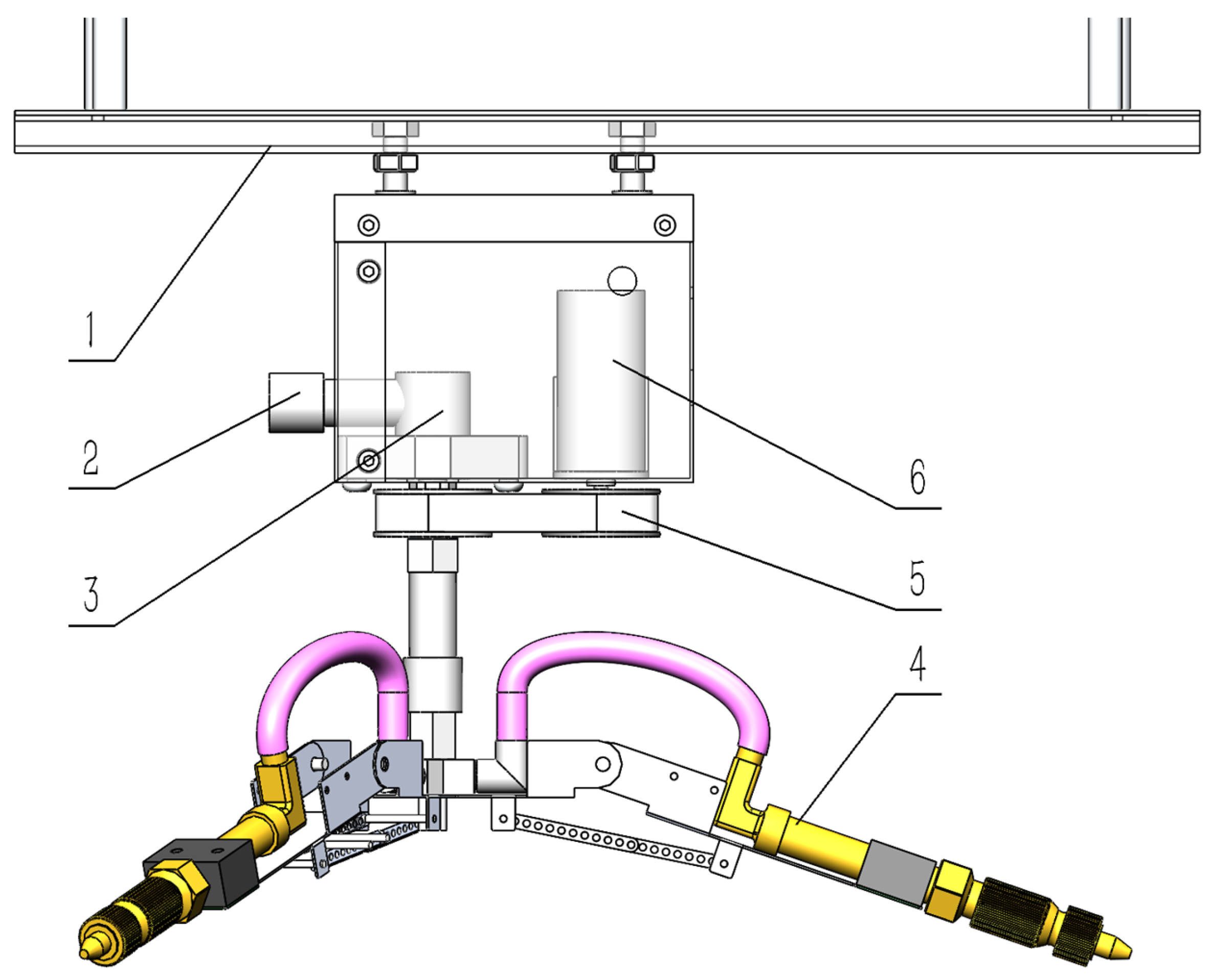 - Height adjustment between the nozzle and treated plants. Currently, height increases/decreases are achieved manually by adding connecting tubes between the high-pressure rotary joint and the one-in-four-out valve. A compact lifting mechanism between the hanging cabinet frame and the rotating spray gun could enable more portable height adjustment.