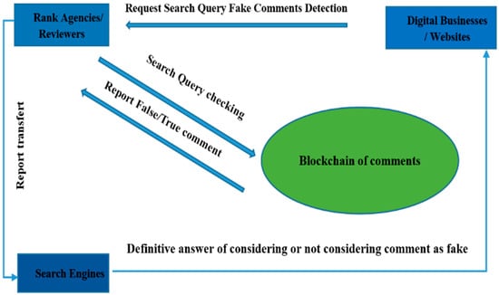 To ensure transparency in digital business environments, we suggested a new Blockchain-based system model. The following diagram illustrates the model used for detecting fake comments. This model is designed for the collection and verification of fake comments by ranking agencies and reviewers. Search engines must be able to respond to all requests from digital businesses and e-commerce sites by indicating whether or not they consider a comment to be fake.