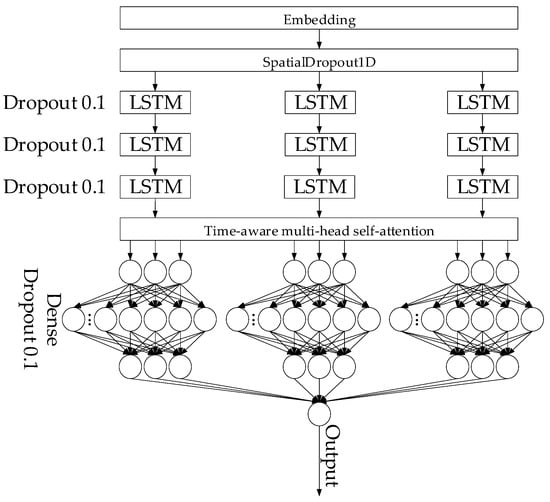 Commentary on Equation (2). If the matrix under consideration is the transition matrix of a hidden Markov model, then its dimension is |S| × |S| (elements are real non-negative numbers (probabilities), rows are normalised (sum is 1), and when using the embedding matrix E, its size is |V| × m (in this study |V| ≈ 587, m = 128), the elements are real (trainable) parameters) and its number of elements is |S|2. If the state is encoded by a one-hot vector, then this is a vector of length |S| (the number of elements is |S|, of which elements are binary {0,1}). When using state embeddings, the embedding matrix has size |S| × m and contains |S| × m elements, where m is the embedding dimension. The parameter N in (2) is the observed sequence length, i.e., the number of pairs (aik, tk) in a given session (the number of events). (In this study, a typical value of N will be used, which is about 102… ≈ 120; but, in general, N is specified individually for each sequence.)