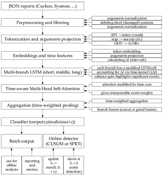 A method based on the multiscale time-aware LSTM with salience gates, multi-headed attention mechanism, and sequential change detector CUSUM integration is developed, which provides a simultaneous solution to three problems: robust modelling of long behavioural sequences, interpretable localisation of informative events, and early statistical detection of anomalies with low latency. This approach allowed us to achieve high accuracy (F1-score ≈ 96%) while maintaining operational requirements for latency (≈3 s) and the level of false alarms (FPR ≈ 2–3%).