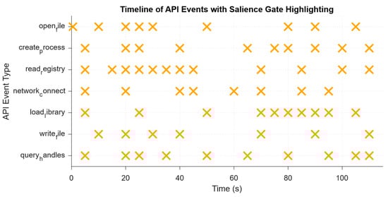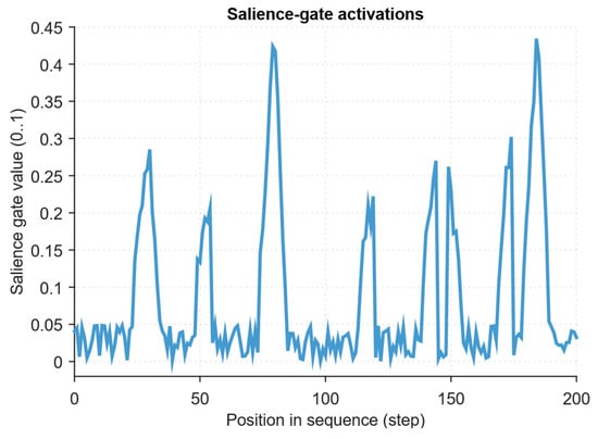The developed time-aware architecture (multi-scale LSTM with salience gates, time-aware multi-head attention, and online CUSUM detector) provides interpretability and early warning due to the following mechanism. At the same time, the attention heatmap highlights rare attention-sharp peaks (≈5% of positions in the session), which localise individual “signal” API steps, and the salience gate forms an activity-smoothed time profile, of which peaks are consistent with increased attention and statistically often precede the CUSUM statistics growth. In the conducted computational experiment, the first CUSUM alarm was recorded around step 180, despite the fact that attention and salience peaks occurred earlier.