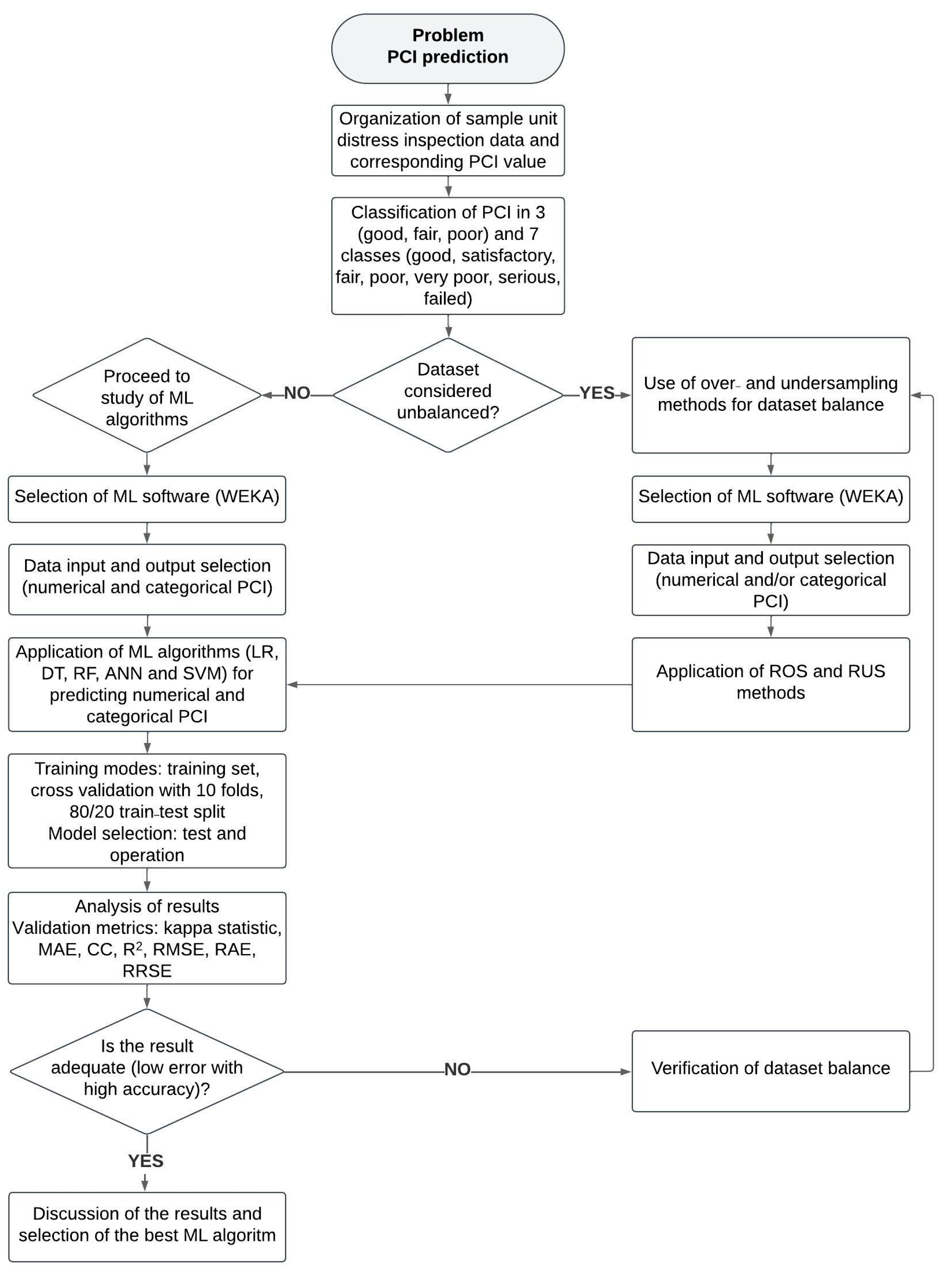 - The success of ROS (SMOTE) in the seven-class PCI prediction was marked by a significant increase in the Kappa statistical value (from 0.58 to 0.91). Conversely, RUS proved unsuccessful, likely due to the resulting reduction of an already limited database. However, the limited number of initial instances in certain classes (e.g., ‘failed’, ‘good’, and ‘fair’) might have constrained the SMOTE technique’s effectiveness in generating meaningful synthetic cases.