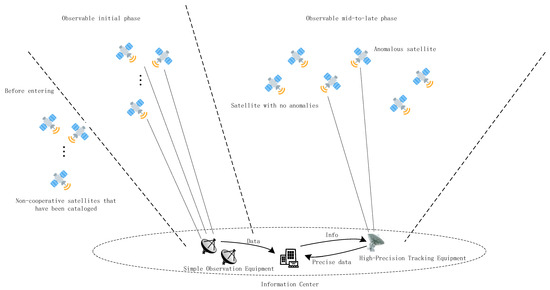 The experiment scenario described in this paper involves ground-to-air observation, specifically tracking and observing non-cooperative space targets using ground-based observation resources. This experiment scenario is divided into three phases: before cataloged non-cooperative satellites enter the observable region, the initial phase upon entering the observable region, and the mid-to-late phase. Prior to the entry of non-cooperative satellites into the observable region, simulations are conducted using existing satellite catalog information and STK software to generate both anomaly free satellite tracking observation data and various types of anomaly containing satellite tracking observation data. Based on simulation data, hundreds of Attention-based Bi-Directional Minimal GRU deep learning network models were trained for hundreds of non-cooperative satellites approaching the observable region. Each satellite corresponds to a specific model. Satellites and ground observation stations are both high-value assets. Authentic and relatively precise satellite tracking and observation data hold immense value and constitute classified information that is difficult to obtain. Therefore, this study primarily relies on simulated data, which represents a limitation of this research. STK utilizes precise physical models and algorithms [13] to generate high-accuracy simulation data, including information such as position, velocity, angular velocity, and attitude during satellite flight. STK has been validated by global professional institutions and NASA. Its simulation data features high precision, diverse types, strong real-time capabilities, excellent visualization, and robust scalability, resulting in highly authoritative outcomes. Satellite tracking data derived from existing catalog information and STK simulation predictions can effectively support model training. After model training is complete, during the initial phase when the satellite enters the observable region, actual tracking data is acquired using inexpensive ground-based satellite tracking observation equipment. Then, the data is fed into the model for analysis, identifying satellites that are highly likely to be anomalous from a large number of non-cooperative satellites. During the latter part of the satellite’s observable window, further consideration can be given to whether to allocate or deploy precision tracking equipment to observe non-cooperative satellites that have been confirmed to exhibit anomalies. The schematic diagram of the experimental scenario is shown in Figure 1.