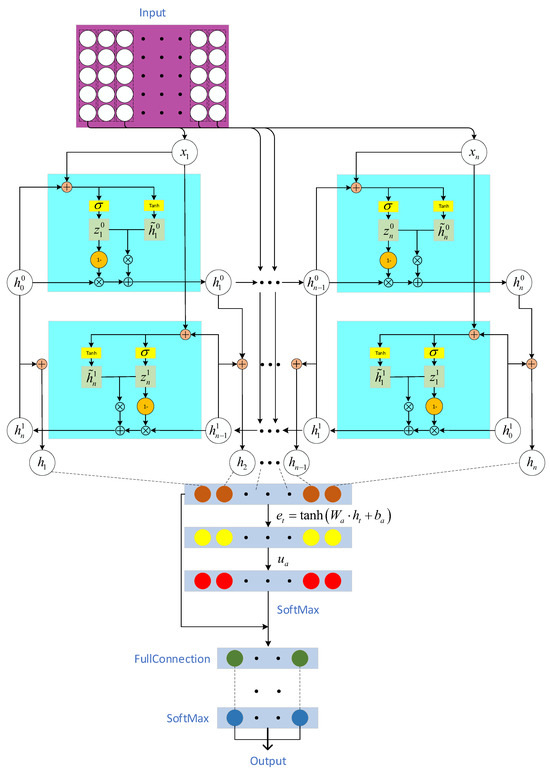 where , , and C denotes the number of classes. represents the final predicted probability distribution. The network architecture diagram of the Attention-based Bi-Directional Minimal GRU model is shown as in Figure 2.