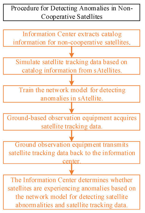 The procedure for detecting anomalies in non-cooperative satellites within this scenario has already been described above. This subsection will detail the process for detecting anomalies in individual cataloged non-cooperative satellites. Before the satellite re-enters an observable region, the information center uses the satellite’s existing catalog information to simulate various tracking observation data, including both normal data and multiple types of anomaly data. Then, we train the pre-built network model for detecting satellite anomalies using simulation data. Once the satellite enters the observable region, it is immediately observed for no more than 20 min using relatively low-performance ground-based observation equipment, and the observation data is transmitted back to the information center. The information center inputs data into the network model to determine whether the satellite is experiencing anomalies. The flowchart for detecting anomalies in non-cooperative satellites is shown in Figure 3.