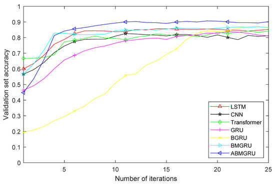 As shown in Table 9 and Table 10, the proposed ABMGRU model achieves an accuracy of 90.3% in this scenario, significantly outperforming all comparison models (p-value < 0.05). Compared to the optimal BMGRU model, ABMGRU demonstrates a 2.9% improvement in accuracy, with this difference being statistically significant (t-statistic = 2.35, p-value < 0.05). Furthermore, the ABMGRU model demonstrated the most outstanding performance across statistical metrics including precision, recall, and F1 score. The training time for the theoretically most complex Transformer model in this experimental scenario was not particularly long. The training time comparison results for the remaining models largely align with the model complexity analysis presented earlier. The additional training time required for ABMGRU is acceptable. The validation set accuracy curves for each model in one independent experiment are shown in Figure 4. The confusion matrix for the ABMGRU in this independent experiment is shown in Figure 5.