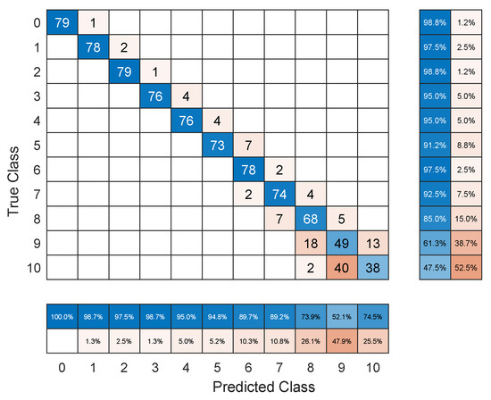 As shown in Figure 4, the performance of ABMGRU stabilizes after 10 iterations, allowing for further reduction in model training time by decreasing the number of iterations. Therefore, while ABMGRU outperforms other models in terms of performance, its disadvantage in computational time is further reduced or even negligible. As shown in Figure 5, except for categories 8, 9, and 10, the false alarm rate for satellite tracking data in other categories is extremely low. Analysis of the data structure for each category reveals that this experimental outcome stems from the data simulation method rather than inherent flaws in the model itself. In this experimental scenario, the actual time span of the raw data ranges from to seconds, where T is between 800 and 1200 s. Each data sample, after preprocessing, contains 100 time steps spanning from to s. According to the satellite’s anomaly force configuration rules in this scenario, the anomaly pulse force configuration node for the 9th category data sample is set at s. Therefore, the characteristics of the 9th category data sample prior to 800 s are nearly identical to those data samples without abnormalities. Meanwhile, the data for some samples after + 800 s was obtained through preprocessing using Kalman filtering. In summary, the differences between the data samples in category 9 and the normal data samples (i.e., category 10) are significantly smaller, making the task of distinguishing between them considerably more challenging, which can be directly observed from the Confusion Matrix of ABMGRU. Such issues arise from the methods of data simulation and preprocessing employed in simulation experiments, rather than from inherent flaws in the model itself, and thus have minimal impact in practical applications.