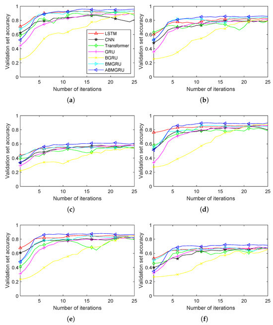 Validation set accuracy curves for each model under different experimental conditions. (a) The magnitude of the pulse force is 2.5 N. The semi-major axis of the orbit is 6,878,137 m. (b) The magnitude of the pulse force is 1.5 N. The semi-major axis of the orbit is 6,878,137 m. (c) The magnitude of the pulse force is 1 N. The semi-major axis of the orbit is 6,878,137 m. (d) The magnitude of the pulse force is 2 N. The semi-major axis of the orbit is 6,928,137 m. (e) The magnitude of the pulse force is 2 N. The semi-major axis of the orbit is 6,978,137 m. (f) The magnitude of the pulse force is 2 N. The semi-major axis of the orbit is 7,078,137 m.