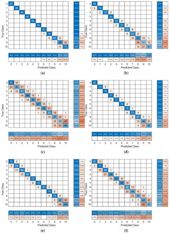 Confusion matrix of ABMGRU under different experimental conditions, using the same color mapping as in Figure 5. (a) The magnitude of the pulse force is 2.5 N. The semi-major axis of the orbit is 6,878,137 m. (b) The magnitude of the pulse force is 1.5 N. The semi-major axis of the orbit is 6,878,137 m. (c) The magnitude of the pulse force is 1 N. The semi-major axis of the orbit is 6,878,137 m. (d) The magnitude of the pulse force is 2 N. The semi-major axis of the orbit is 6,928,137 m. (e) The magnitude of the pulse force is 2 N. The semi-major axis of the orbit is 6,978,137 m. (f) The magnitude of the pulse force is 2 N. The semi-major axis of the orbit is 7,078,137 m.