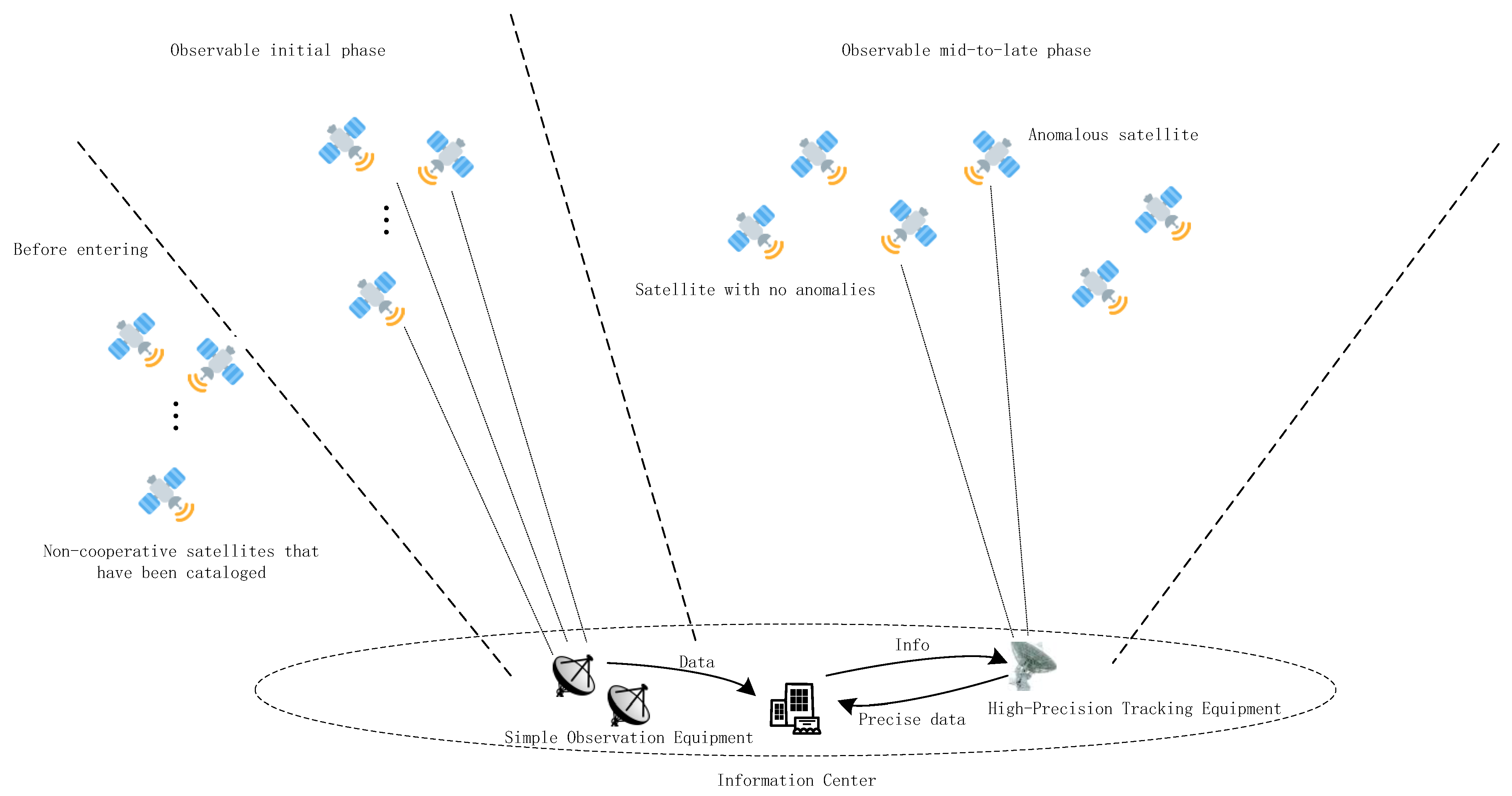 - We propose a method for detecting anomalies in cataloged non-cooperative satellites using low-cost satellite observation resources, thereby providing a decision-making basis for the scheduling and allocation of high-value and high-precision satellite observation resources during tracking and observation of non-cooperative satellites. This experiment accounts for limitations inherent in satellite tracking data from low-cost satellite observation resources, such as relatively high data noise and fewer data categories. To ensure sufficient observation time for subsequent precision tracking, we imposed constraints on the experimental scenario: shorter observation durations and the need for lightweight models. Based on the aforementioned conditions, this paper constructs a deep learning anomaly detection model for cataloged non-cooperative satellites. The objective is to rapidly determine whether anomalies exist during the initial phase when cataloged non-cooperative satellites enter the observable range.