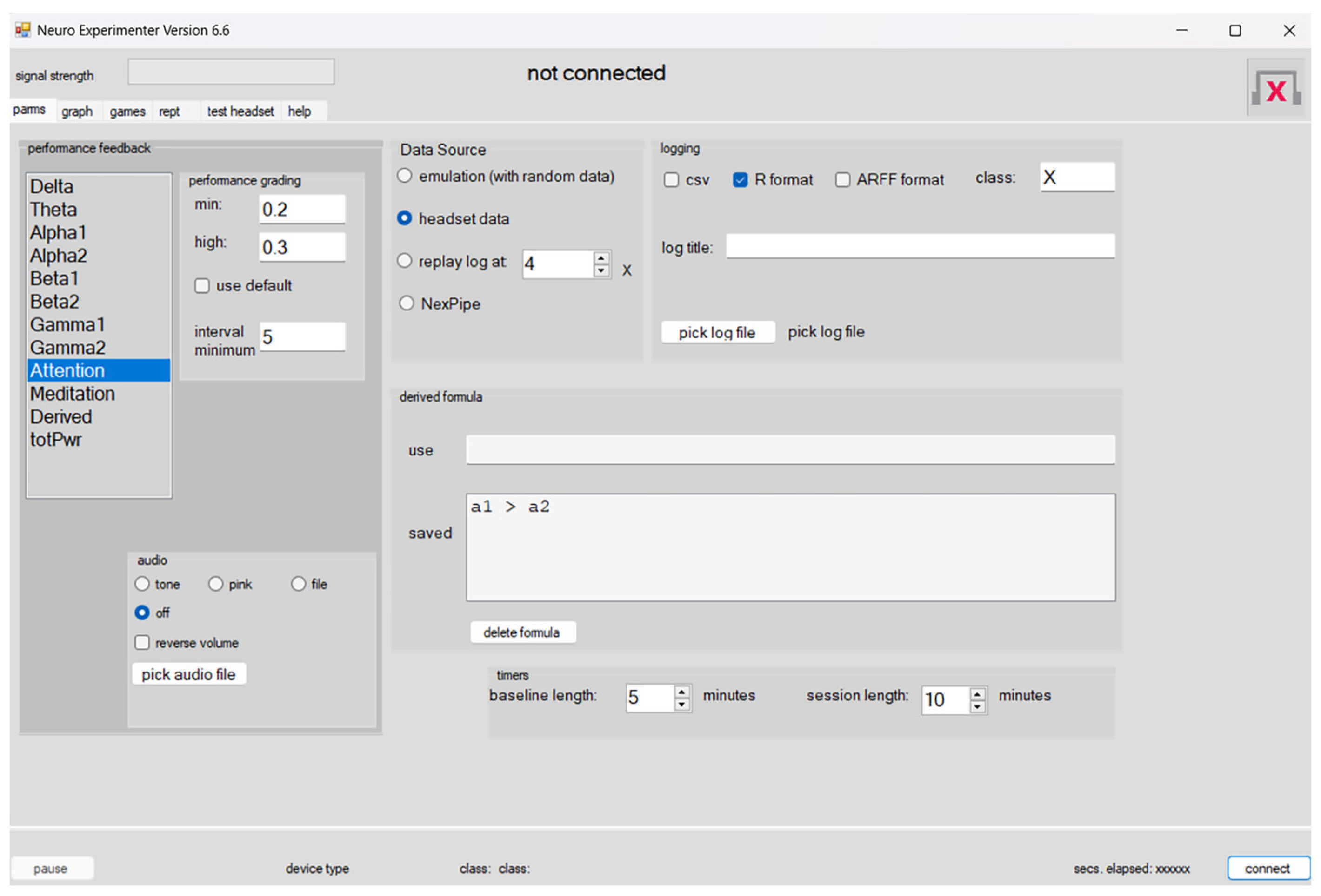 Figure 2. NEx is a free Windows-based application designed to interface MindWave Mobile and similar NeuroSky devices, providing real-time brainwave monitoring, formula-based derived metrics (e.g., meditation, attention), graphical visualizations, and data export capabilities.