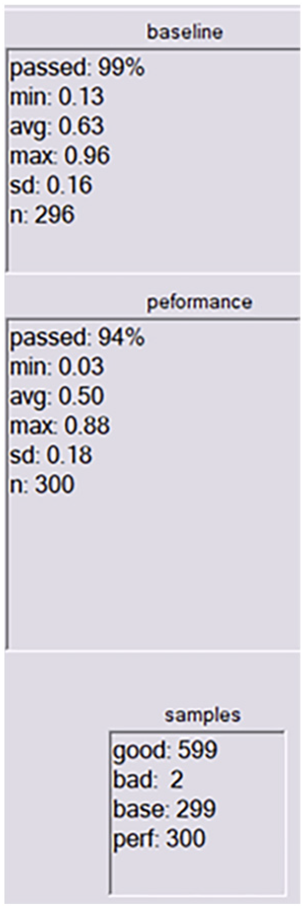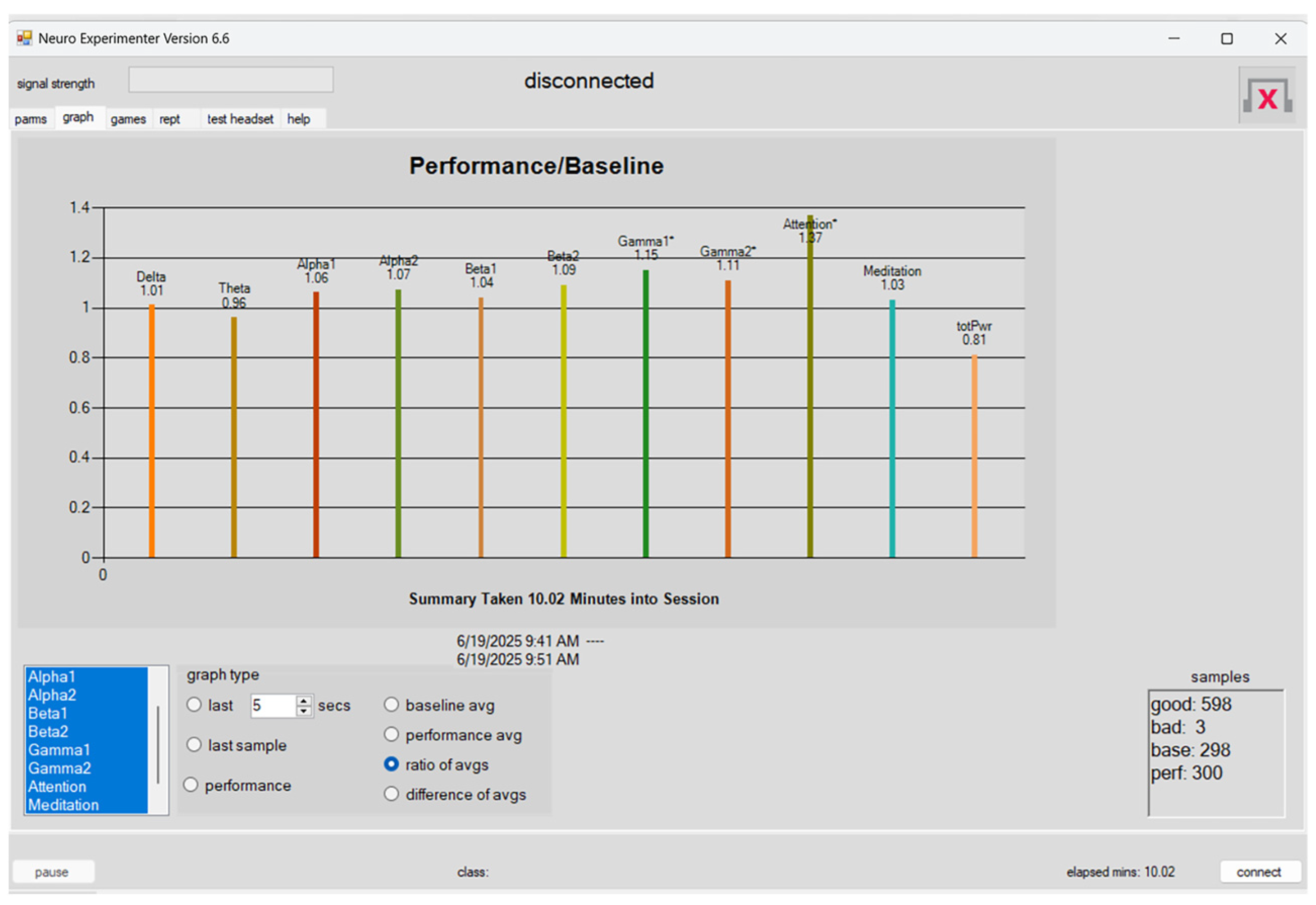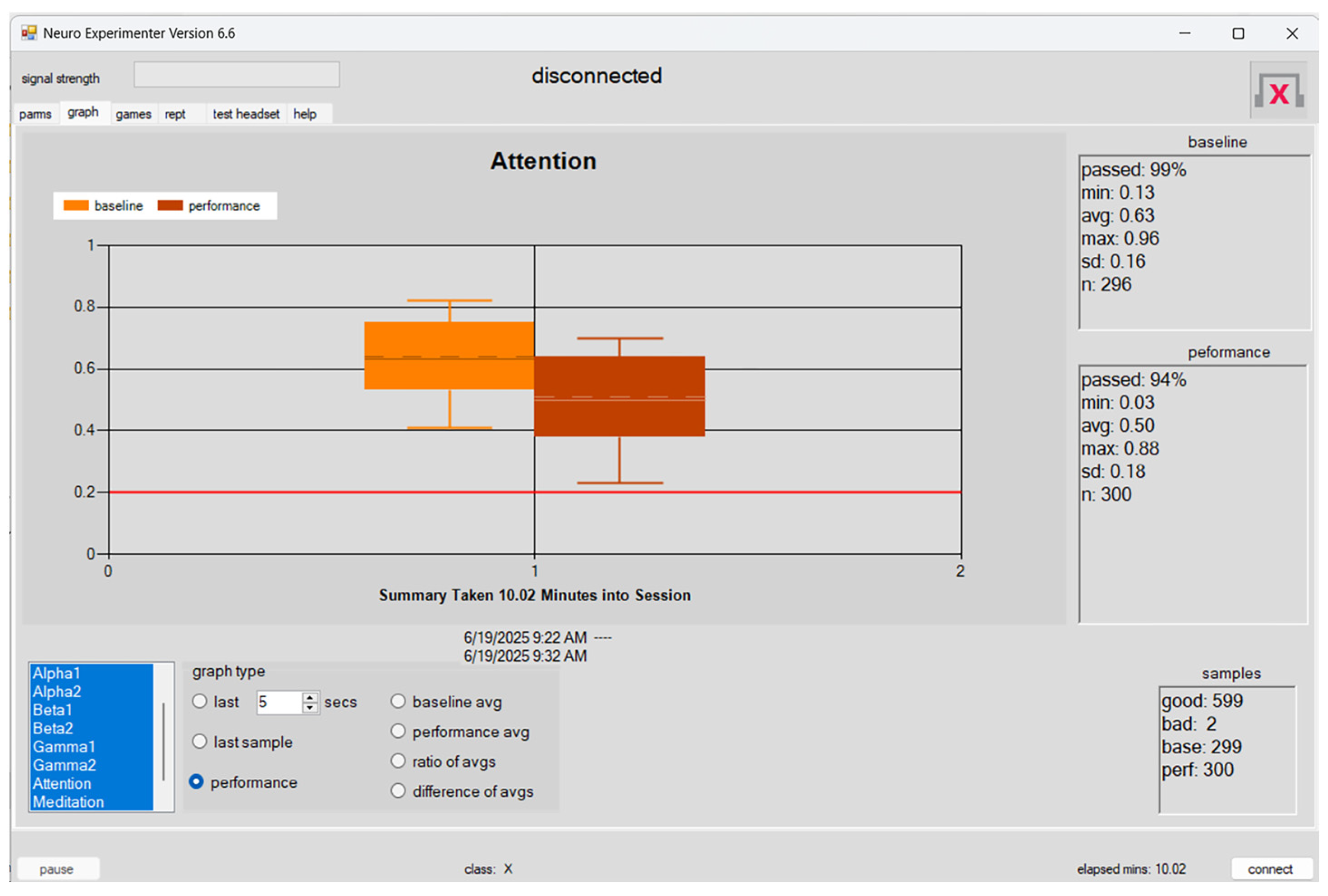 Figure 3). The total samples: good, bad (as determined by the headset; bad samples are discarded by the NEx software), and the total good samples collected during the baseline and performance (post-baseline) parts of the session. When one replays a log, the “good” count is the number of records read, as in