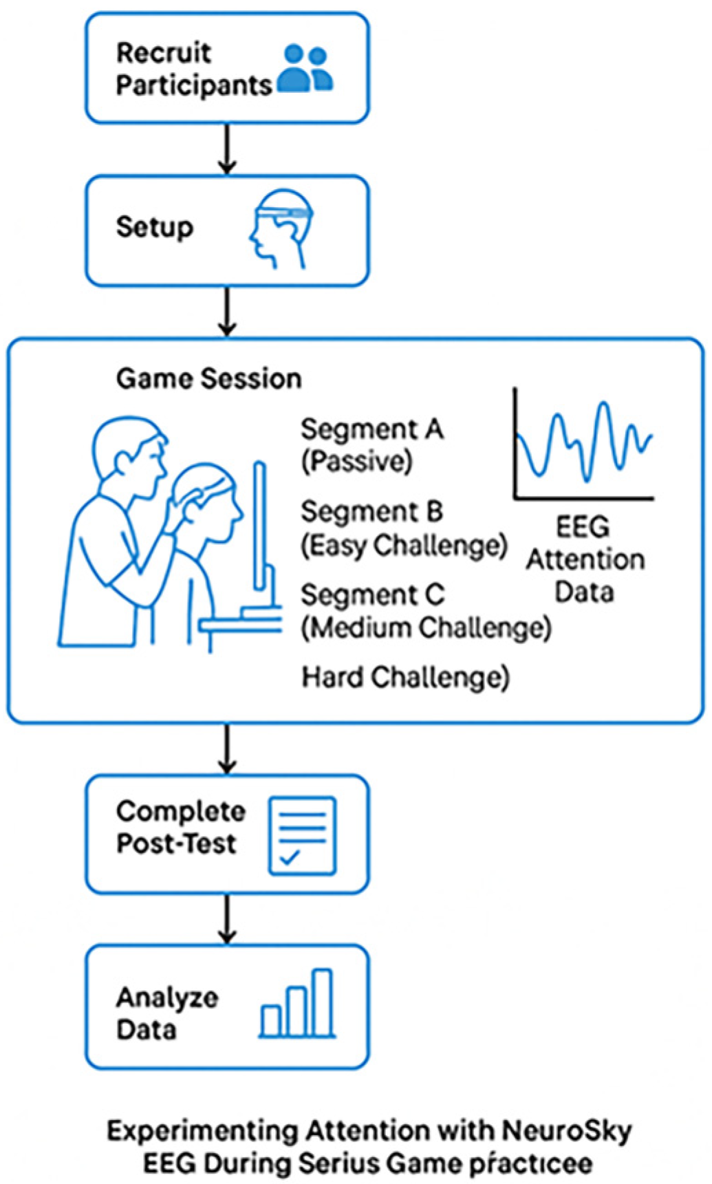 The NeuroSky headset, a consumer-grade brain–computer interface (BCI), measures brainwave activity—specifically, attention and meditation levels—using electroencephalography (EEG). In the context of serious games, it opens new possibilities by providing real-time data about player attention, which can be used to adapt gameplay, improve engagement, and enhance learning. Some of the outcomes of this study are as follows: