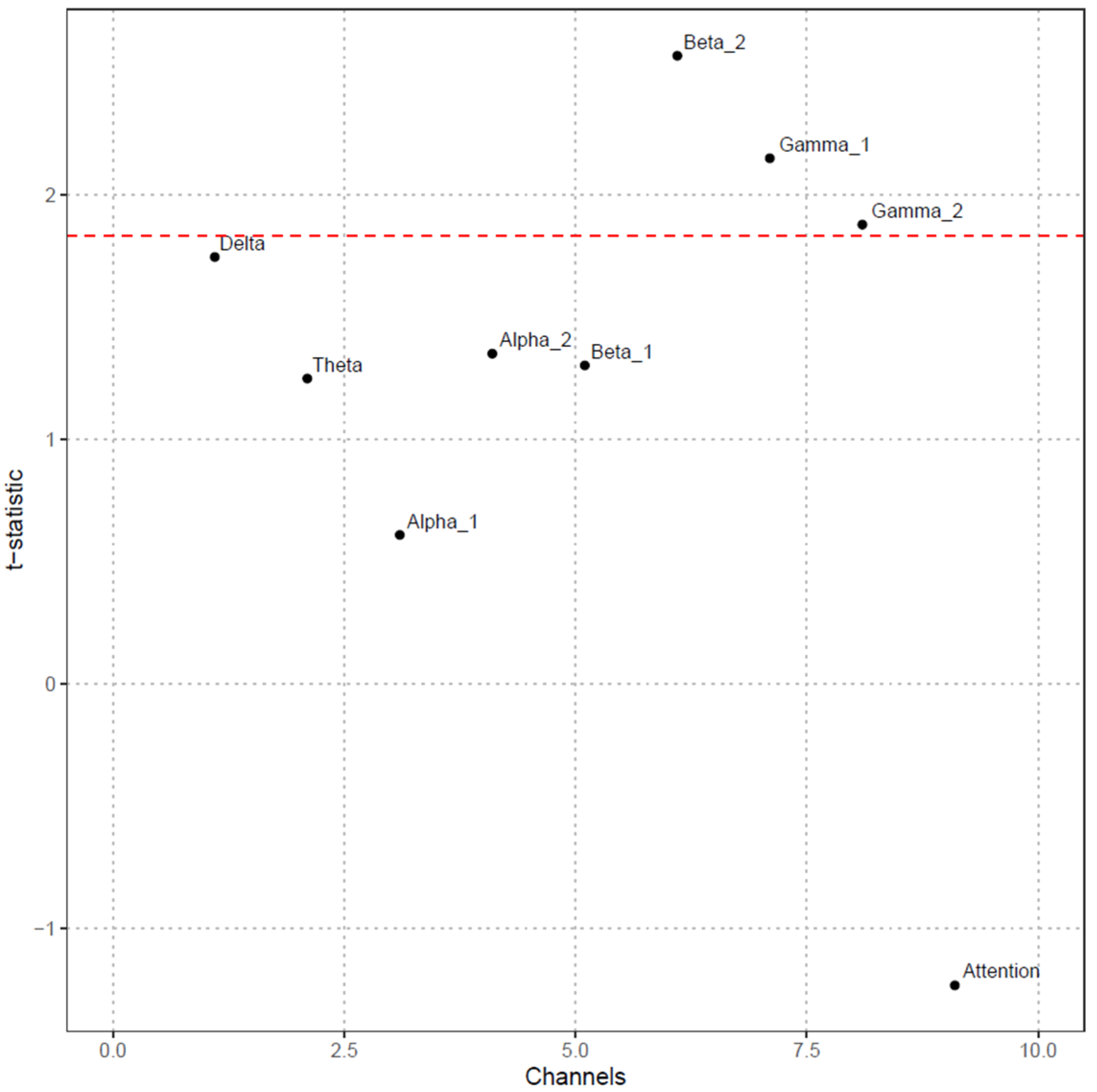 For our study, based on the t-test results, beta 2, gamma2, and gamma3 were significant. Beta 2 (20–30 Hz) is linked to intense focus, high engagement, and sometimes stress or hyperarousal, sustained attention, and task-related engagement under demanding cognitive tasks. Gamma Waves (30–100+ Hz) are associated with high-level cognitive functioning, perception, conscious awareness, working memory, and attentional control. These are present during intense focus, learning, and problem-solving [