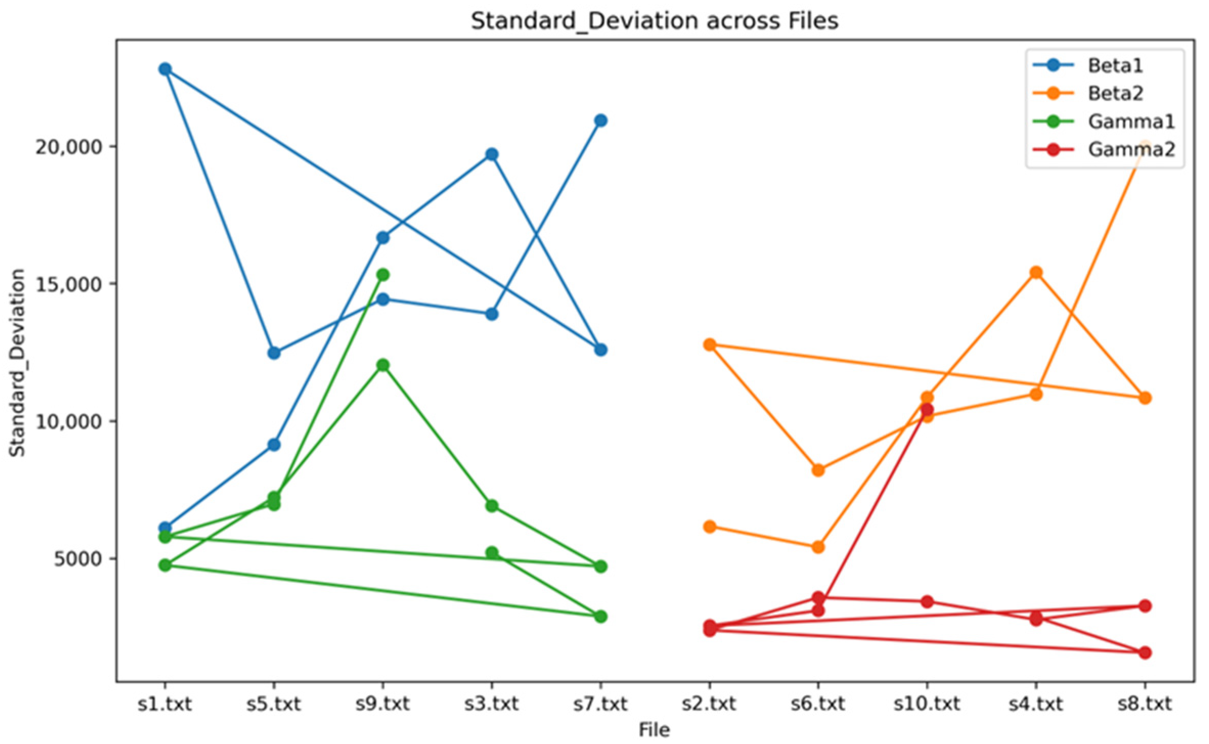 Lowest Variability: Gamma2 consistently has the lowest standard deviation across all recordings, suggesting its values change less compared to Beta1, Beta2, and Gamma1.