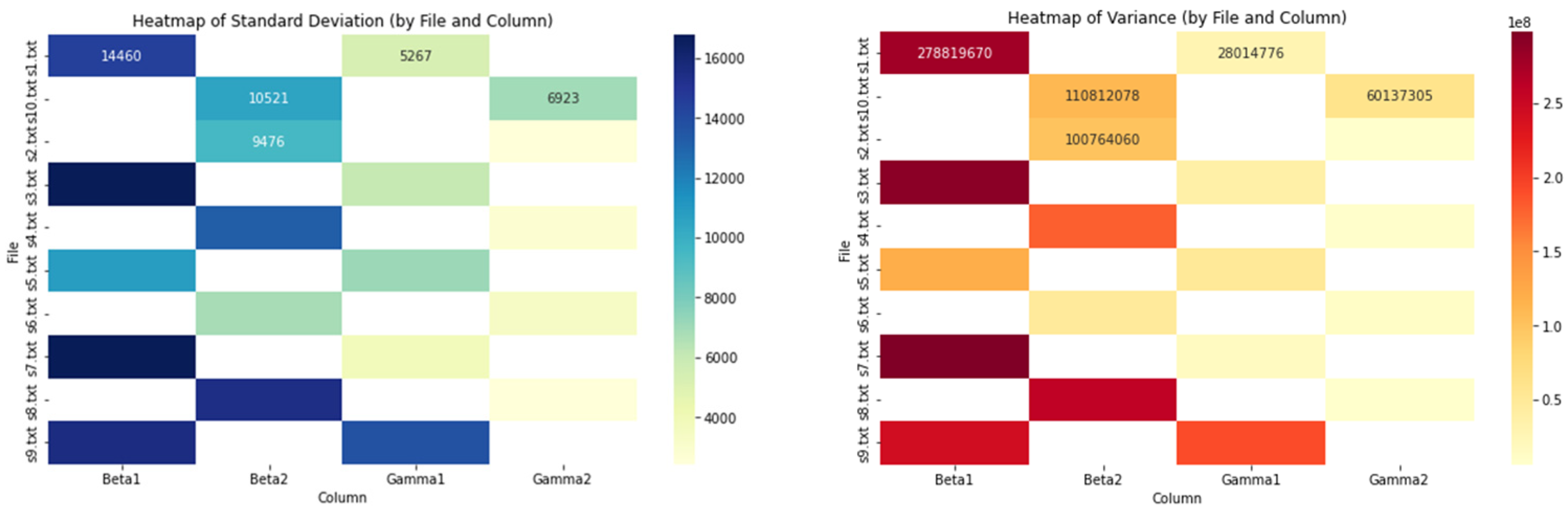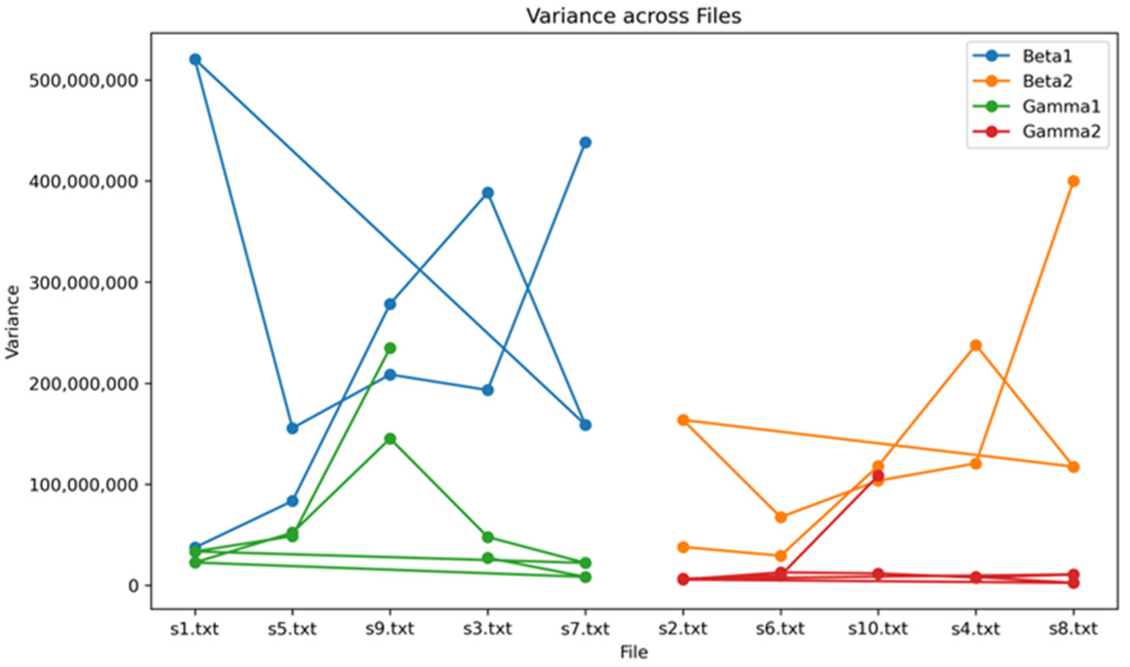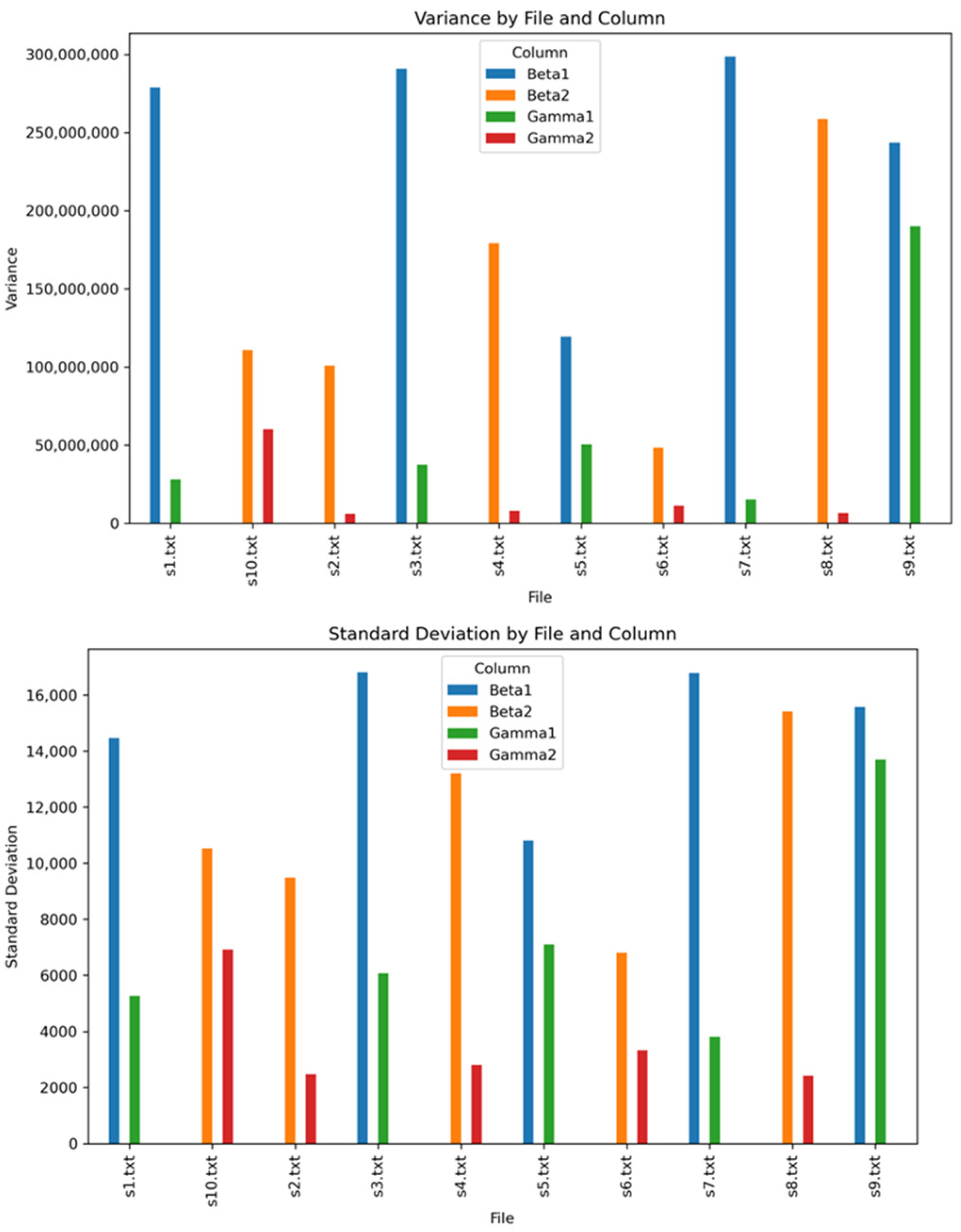 Overall, Beta variables (especially Beta1) dominate in terms of variability, while Gamma variables show much smaller values.