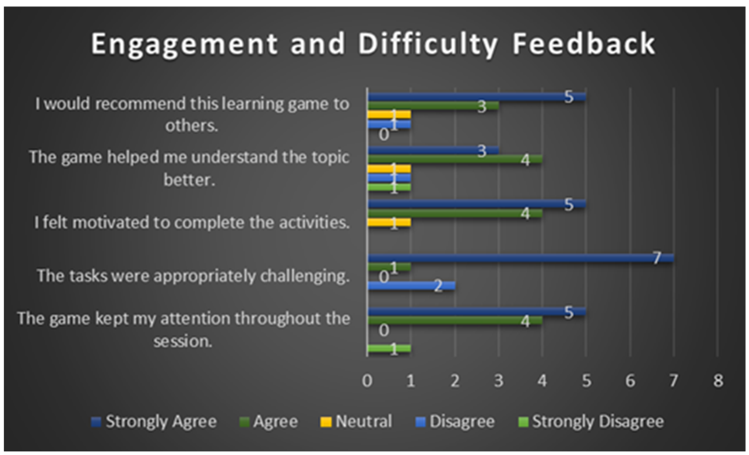 Due to limited resources and the difficulty of recruiting participants, we were only able to collect data from ten students. We acknowledge that this small sample size limits the generalizability of our findings. Also, the homogeneity of the participant group, which consisted solely of master’s students in computer science enrolled in the same course, limits the statistical power of our analyses and the generalizability of our findings to other populations. However, there is diversity in the sample (e.g., age range between 21 and 40, gender imbalance of three feminine and six masculine) that may slightly contribute to the generalizability of our findings. While the small sample size limits the quantitative results, the qualitative data obtained from the post-experiment questionnaire provide valuable insights into the overall evaluation of students’ experiences regarding serious games as a means of acquiring specialized knowledge. These insights inform future research and interventions.